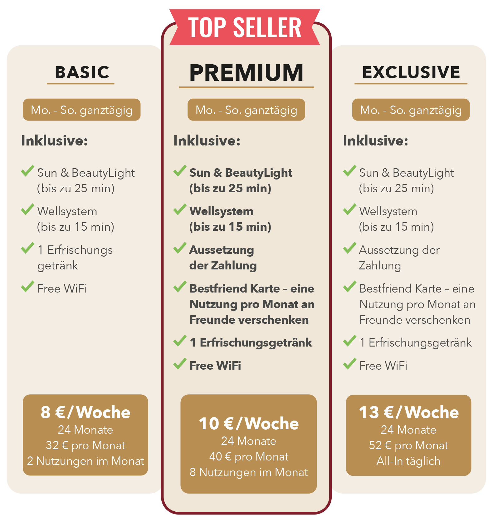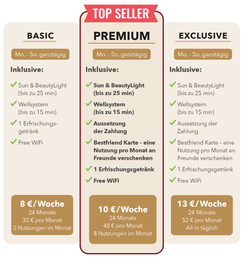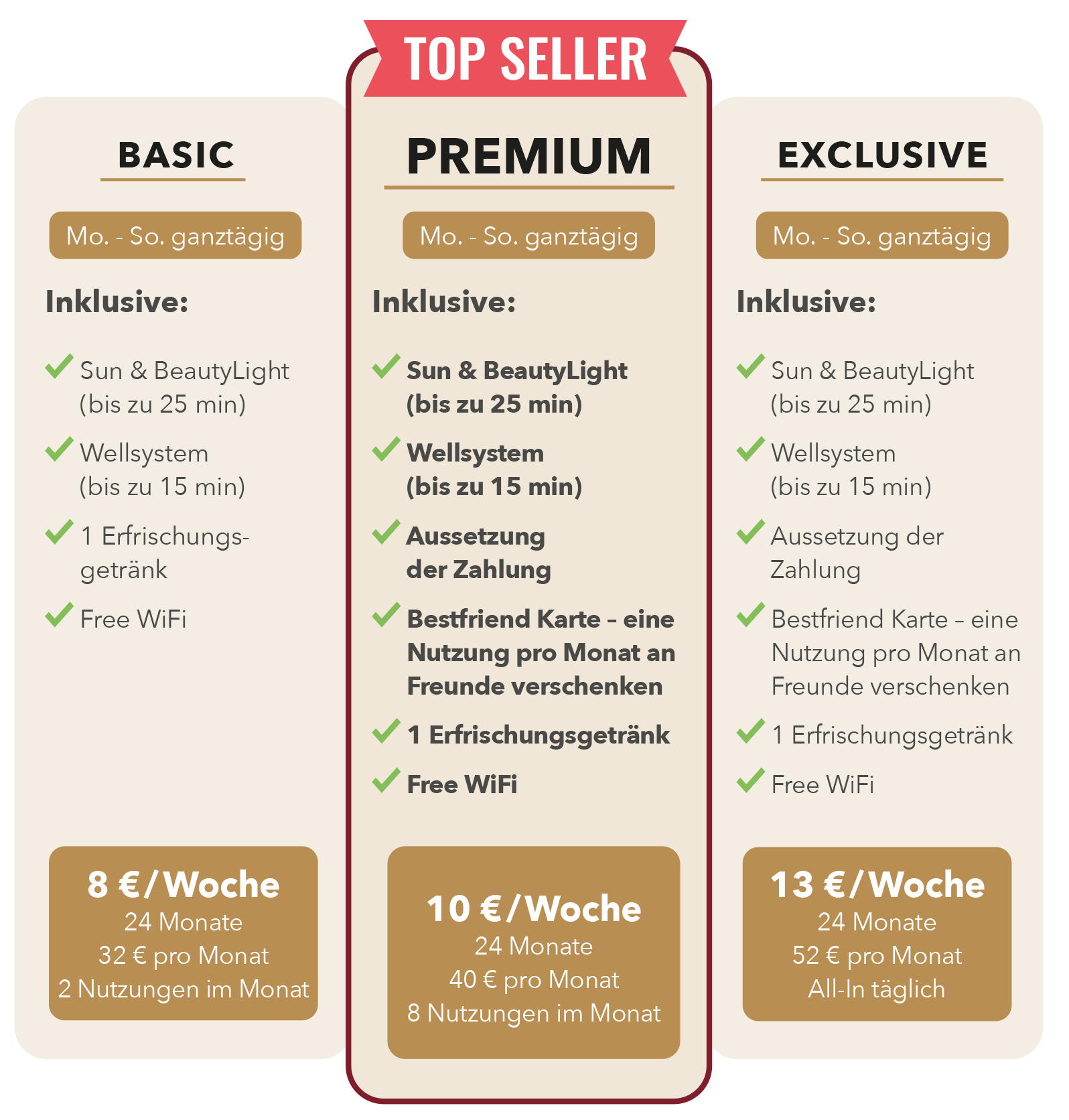 Hier findest du die weiteren Leitungsmodule deines Sonnenstudios Suntime No. 1 in Rheda-Wiedenbrück aufgelistet. Diese kannst du zusätzlich in das von dir gewählte Paket (Premium & Exclusive) buchen.